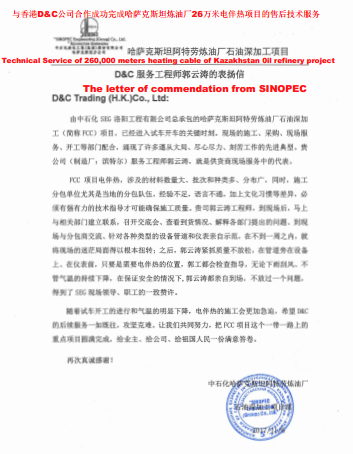 此此項(xiàng)目主要生產(chǎn)區(qū)域設(shè)計(jì)并使用美國(guó)Raychemd電伴熱產(chǎn)品,由我方與香港D&C公司合作完成中石化阿特勞煉油廠(chǎng)三期38萬(wàn)米電伴熱技術(shù)服務(wù)工作,我方服務(wù)團(tuán)隊(duì)積極配合客戶(hù)Sinopec工作和現(xiàn)場(chǎng)臨時(shí)設(shè)計(jì)變更服務(wù),現(xiàn)場(chǎng)合理安排與溝通協(xié)調(diào);春節(jié)放棄與家人團(tuán)聚,確保極寒情況下生產(chǎn)工藝溫度要求,積極配合業(yè)主圓滿(mǎn)完成阿特勞三期煉...